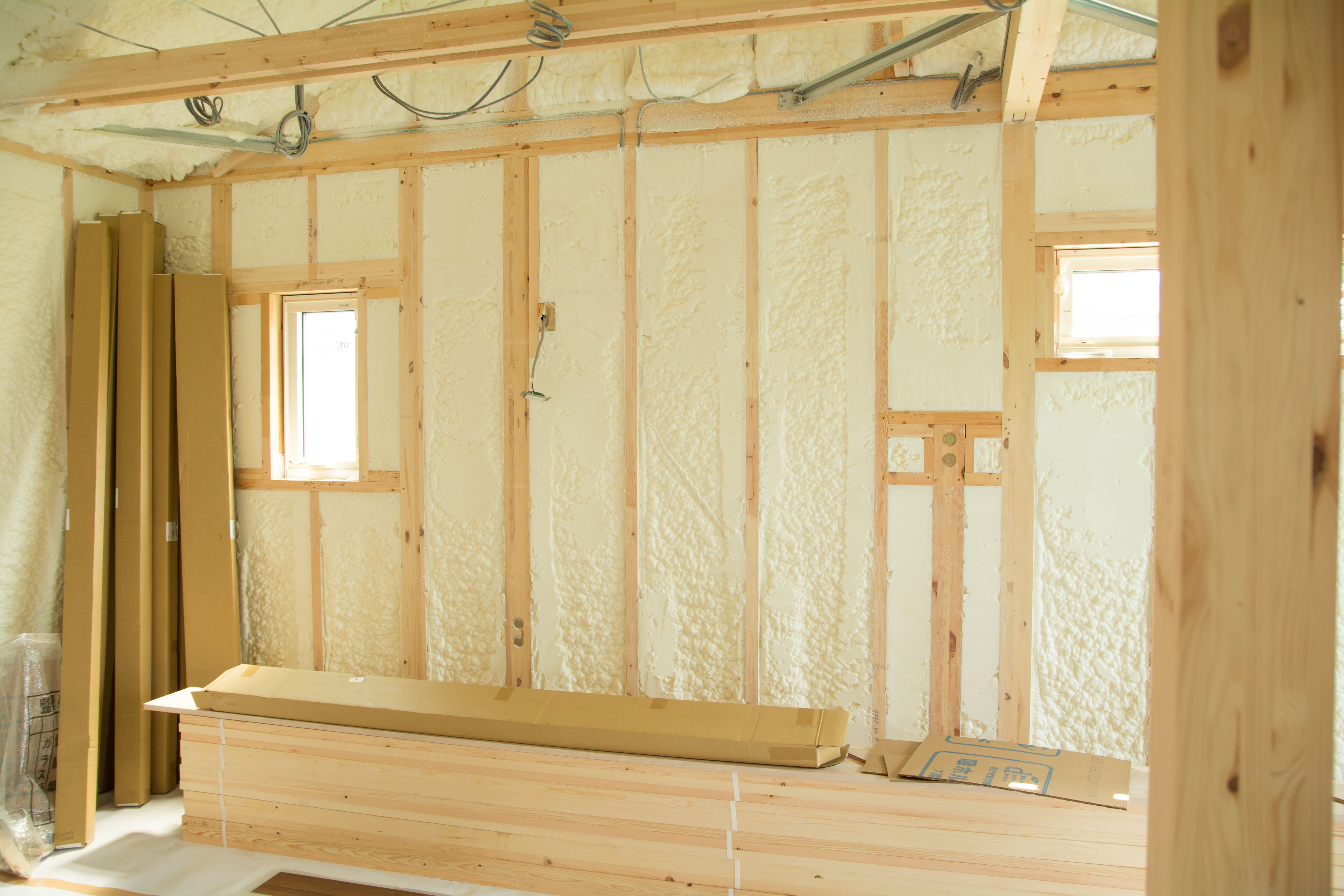 ベーシックな断熱工法です。断熱欠損の少ないウレタン断熱材の吹付を推奨していますが、グラスウールの充填も採用しています。ウレタン断熱材の吹付の場合は、家全体の気積が少なくなる桁下吹付を推奨しています。